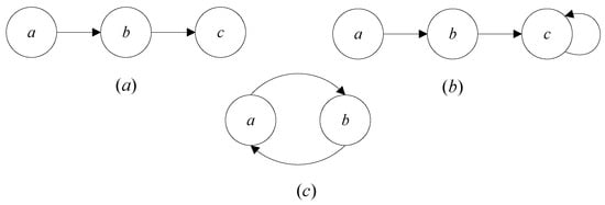 Example of grounded extension. Directed edges represent attack relations. (a) there is a relationship of defense, with a defending against c; (b) there is a relationship of self-attack; (c) there is a relationship of mutual attack.