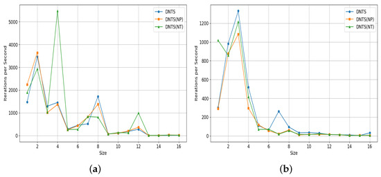 The evaluation of iterations per second with the growth of the problem size. The x-axis represents the increasing size of instances from left to right. (a) Experimental results for sparse graphs; (b) experimental results for dense graphs.