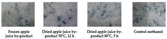 | Sample Parameter | Control Methanol | Frozen Apple By-Product | Dried Apple By-Product (50 °C/12 h) | Dried Apple By-Product (80 °C/5 h) |