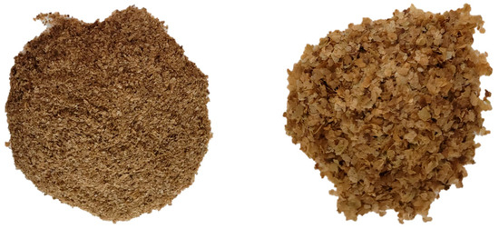 Chicken breast meat, animal fat, garlic, onion, egg, breadcrumbs, and spices used as materials in the study were bought from the local market. Dry CSS derived from a mixture of Arabica varieties was obtained from Miko Gıda (Antalya, Türkiye) and Gönen Kuru Kahve (Izmir, Türkiye) companies. The biomass was ground in a miller (Vorwerk Thermomix TM6-1, Wuppertal, Germany) and sieved to a size of 125–250 µm. Ground and unground coffee silverskin are shown in Figure 1.