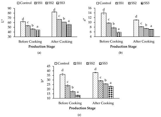 Changes in color properties of chicken patties during the production stages (Control: 12% fat, SS1: 10% fat + 2% silverskin, SS2: 8% fat + 4% silverskin, SS3: 6% fat + 6% silverskin). a–d: Means marked with different letters in different formulations at the same production stage are statistically different from each other (p < 0.05). (a) L*: represents the lightness values, (b) a*: represents the redness/greenness values, and (c) b*: represents the yellowness/blueness values.