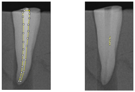 Digital periapical radiographs were taken using a size 2 photostimulable phosphor plate, parallel technique, and a 30 cm focal distance. The samples and the phosphor plate were positioned on a customized model made of polyvinyl siloxane in repeatable positions for each phase of the radiographic examination sequence. The customized model was positioned on a radiolucent support, which was modified to achieve a repeatable position for housing the model. The X-ray tube was placed on a rigid plane in contact with the radiolucent support to maintain a standard distance from the customized model, on which the samples were placed (Figure S1). The DICOM files obtained were analyzed using the open-source software ImageJ (NIH software Version 1.54, Bethesda, MD, USA software version 1.54f) (Figure 2). For each sample, the region of interest (ROI) was manually delineated by a single operator. Operations to determine the ROI surface value were performed automatically by the ImageJ software. The canal area was individually measured in the coronal, middle, and apical thirds. Measurements were taken from the radiographs obtained during sample selection, after initial instrumentation, after retreatment with RB40, and after retreatment with RB50. The area of remnants was obtained using the same technique as for the canal area. The area of remnants was measured separately in the coronal, middle, and apical thirds after retreatment with RB40 and after retreatment with RB50.