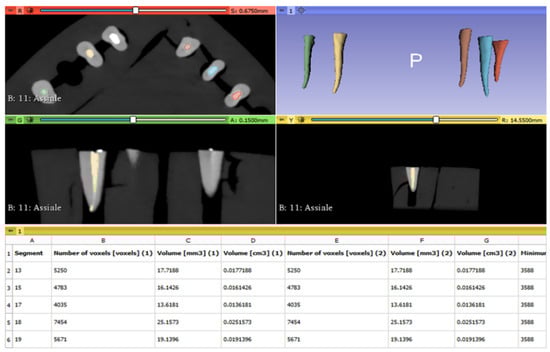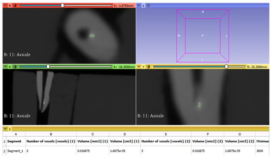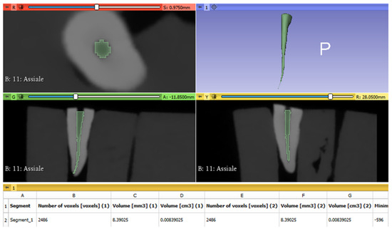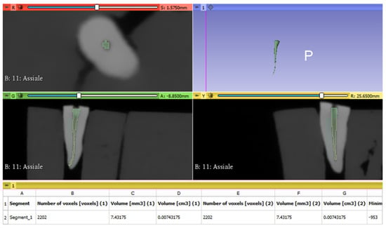 CBCT examinations were performed following the digital radiographic procedures. The obtained DICOM files were analyzed using the open-source software Slicer 3D (Figure 3, Figure 4, Figure 5, Figure 6 and Figure 7). The volume of the entire canal and the volume of canal filling residues were measured. The canal volume and the volume of filling material residues were manually segmented using the “segment editor” function. Manual segmentation was performed on the axial, coronal, and sagittal planes (Figure 8). Operations to determine volume measurements were automatically performed by the software using the “segment statistic” function. Measurements were taken at the preoperative level, after initial instrumentation, after canal filling, after retreatment with RB40, and after retreatment with RB50. For the CBCT images, the customized model was again positioned on the modified radiolucent support to ensure a repeatable setup. The same standardized procedure for positioning and distance maintenance was followed (Figure S1).