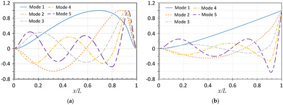 As mode shapes play a crucial role in evaluating the accuracy of structural dynamics modeling, the first five bending mode shapes associated with the appropriate frequencies of AFGM beams with for C-C and C-F boundary conditions, as listed in Table 11 and obtained using the DTM, are plotted in Figure 4a,b, respectively.
