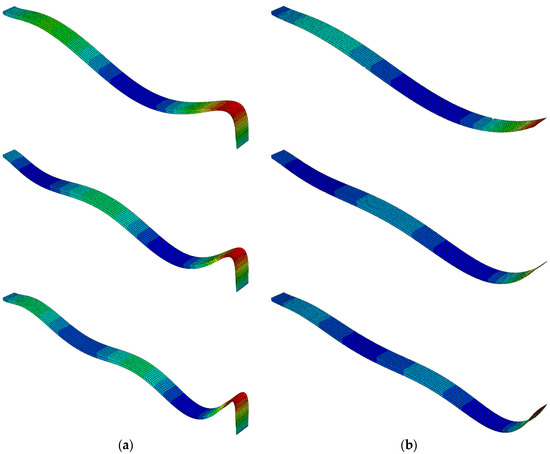 Analogously, Figure 5a,b illustrates the bending mode shapes of the same truncated AFGM beams, constructed based on the FEM results, which are given in Table 11.
