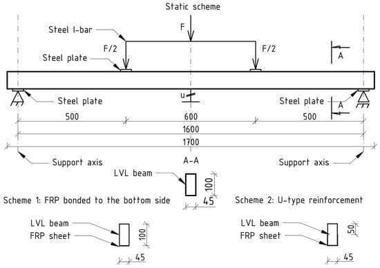 Experimental tests were carried out on non-strengthened and strengthened laminated veneer lumber beams with nominal dimensions of 45 × 100 × 1700 mm purchased from Steico (Czarnków, Poland) [17]. The beams were reinforced with composite sheets bonded to the bottom surface only over the entire length of the beam (scheme 1) and to the bottom surface and half the height of the side surfaces (scheme 2), as shown in Figure 1. Four sheet types manufactured by S&P Reinforcement Poland (Malbork, Poland) were used for reinforcement including aramid fiber-reinforced polymer (AFRP) [18], glass fiber-reinforced polymer (GFRP) [19], carbon fiber-reinforced polymer (CFRP) [20], and ultra-high modulus carbon fiber-reinforced polymer (CFRP UHM) [21] ones. The test series were marked with letters depending on the type of fiber used: aramid (A), glass (G), carbon (C), carbon ultra-high modulus (CH). The suffix U refers to the configuration of the U-type reinforcement. An epoxy resin-based adhesive (manufacturer’s reference, S&P Resin 55 HP) was used to bond the sheets [22]. Figure 1 shows a schematic of the strengthening and test bench.