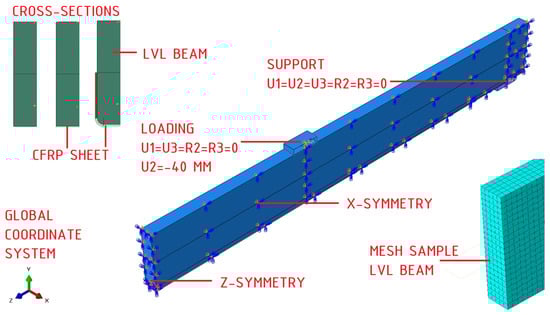This section gives a general description of the numerical models created and the material models assumed. Due to the system’s bisymmetry, only ¼ of the actual beam was prepared. The displacements U1, U2, and U3 and the rotations R1, R2, and R3 are assigned to the x, y, and z axes of the global coordinate system, respectively.