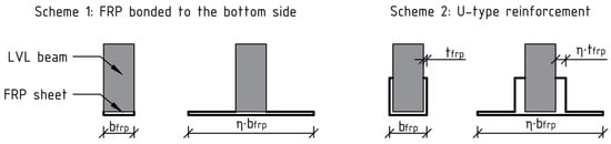 where ELVL is the modulus of elasticity of laminated veneer lumber (Table 3), and EFRP is the modulus of elasticity of composite material (Table 1). This factor is then multiplied by the horizontal dimension of the composite. In the case of the reinforcement bonded to the bottom, this is its width. For the composite placed on the sides it is the sheet thickness.
