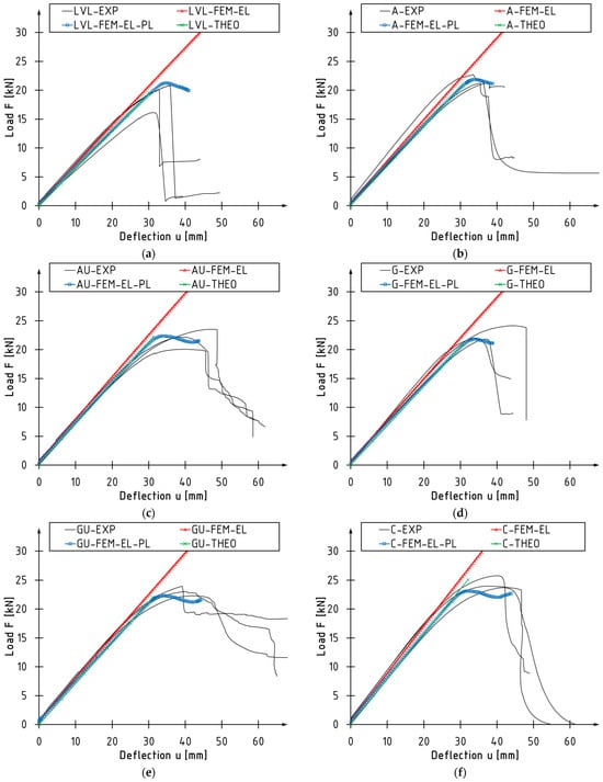Figure 4 plots the relationship between loading force and deflection measured at the center of the horizontal span of the extreme tensile fibers. The red color with markers indicates the curves for the linearly elastic model. In contrast, the blue color with markers represents the elastic–plastic model of laminated veneer behavior obtained from the numerical analyses. The green color with markers indicates the results obtained from the theoretical model. The black curves represent the experimental results obtained from [16]. The green and red curves exhibit linear behavior throughout the test range. The models labeled FEM-EL were plotted significantly beyond the scope of the experimental studies. The models designated as THEO were plotted from the beginning of the test until the theoretical maximum loading force was reached. The FEM-EL-PL model curves show a linear relationship from the beginning of the test until the proportionality limit is reached. After that curve course becomes non-linear. Compared to the other models prepared, they are the most representative of the experiment.