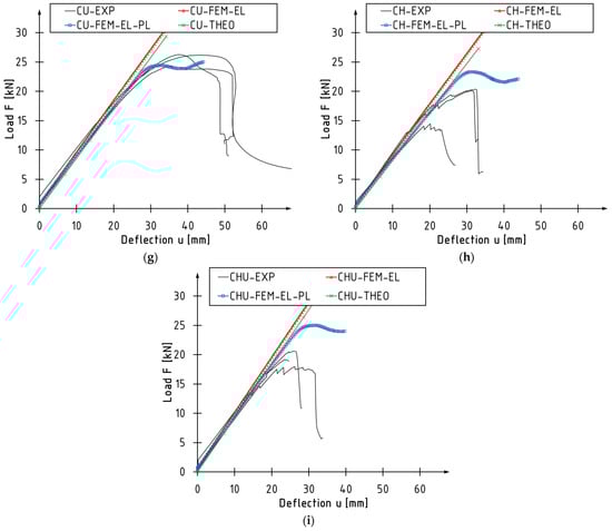 Comparison of experimental [16], theoretical, and numerical load versus deflection curves, for series: (a) LVL; (b) A; (c) AU; (d) G; (e) GU; (f) C; (g) CU; (h) CH; (i) CHU.