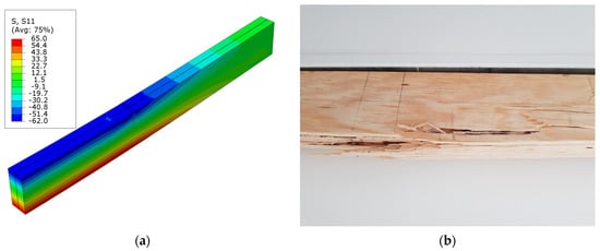 The stresses presented in this section were expressed in megapascals in the figures. Normal stress maps for composites and laminated veneer lumber were juxtaposed with the typical failure modes obtained for experimental tests. The goal of that comparison was to prove the applicability of numerical simulations for predicting the location of the failure and indicating the weakest link in the composite–LVL chain.
