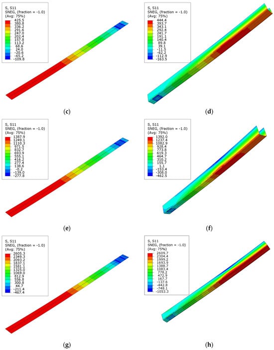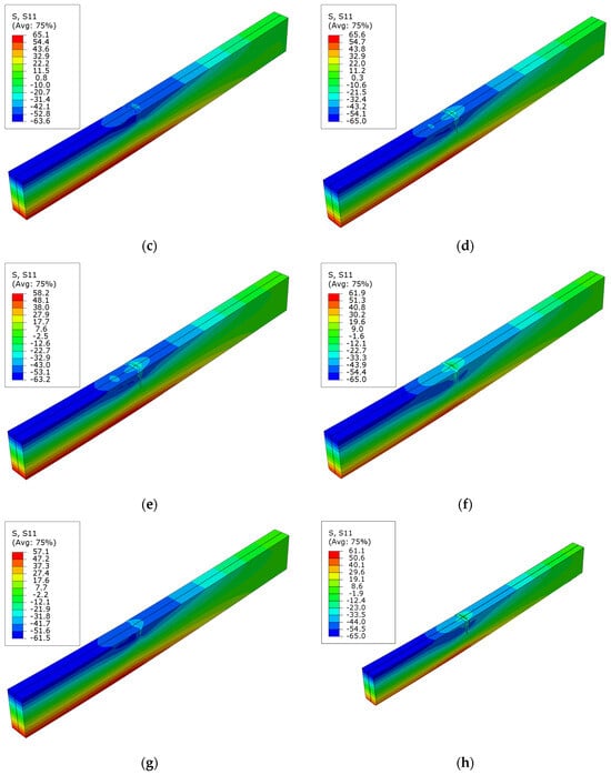 Normal stress S11 distribution for laminated veneer lumber at ultimate load, for series: (a) A; (b) AU; (c) G; (d) GU; (e) C; (f) CU; (g) CH; (h) CHU.