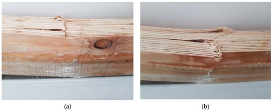 In the case of reference beams, the maximum stresses are equal to the assumed yield strength. The maximum tensile stresses were slightly higher than the compressive stresses. The destruction of unreinforced beams was attributed to the brittle fracture of the LVL in the tension zone (Figure 5). A slight deformation in the veneer was observed at the point of application of the concentrated force [16].