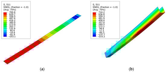 In the case of laminated veneer lumber, two types of material models were verified: a linear elastic one and a linearly elastic–perfectly plastic one considering Hill’s yield criterion. Table 2 and Table 3 show the mechanical and orthotropic properties of the material. These were determined based on our experimental studies [16], the manufacturers’ data [17], and the findings of other researchers [25]. The yield stress was used as the bending strength value determined experimentally on unreinforced members.