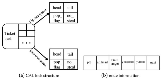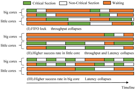 However, it’s impractical for OS (Operating System) to schedule multiprocessing programs on only big cores or little cores [3,4]. The existing scheduling strategies, when executing scheduling tasks, tend to overlook the disparities among cores. As a result, the multiprocessing programs are randomly assigned to both big and little cores. When big and little cores collaborate on task processing, and locks are required to sync data between cores. Note that locks are employed by OS to synchronize data between processes and achieve mutually exclusive access to critical resources. These existing lock algorithms are designed and optimized to meet the specified hardware topology, e.g., the hierarchical lock is proposed for NUMA (Non-Uniform Memory Access) architecture to reduce cross-node communication overhead, and ttas (Test-And-Test-And-Set) lock is proposed to mitigate the frequent cache line invalidates caused by atomic instructions. Ttas lock is a spinlock algorithm used in concurrent programming, particularly in environments where multiple threads need to access shared resources in a mutually exclusive manner to prevent race conditions. It’s an optimization over the traditional Test-and-Set lock, designed to reduce the contention caused by spinning (continuous checking) when the lock is already held. Spinlock constitute a simple synchronization primitive wherein, upon a thread’s attempt to acquire a lock already held by another thread, instead of immediately relinquishing its CPU timeslice, the thread engages in a continuous loop of checks (spinning) until the lock becomes available. Ticket locks manage access to the lock through a queueing mechanism; each thread requesting the lock obtains an incrementally increasing “ticket” number and subsequently awaits its turn to acquire the lock as indicated by its ticket number being called. Cptltkt lock realizes a queued lock scheme, encompassing both global partitioned ticketing and local ticketing mechanisms for lock management. In the big.LITTLE multicore architecture, due to the performance gap between big core and little core, big core executes the same critical section faster than little one, which leads to the non-scalability of the inherent fairness of traditional locks.