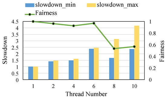 The means the ratio of the minimum and maximum slowdown ratios suffered by threads in a concurrent execution environment, and the range of is between 0 and 1. The closer it is to 1, the more fair the slowdown suffered by each thread is. Figure 3 shows the fairness variation of ticket lock. When running on the cores with the same type, the slowdown ratios tend to be the same, and the fairness approaches to be 1. When the multicore process begins to use little cores, the big and little cores suffer different slowdown ratios, and the fairness drops sharply. The lock algorithm we design mainly makes each thread suffer the same slowdown ratio as that in the homogeneous computing architecture. The fairness tends to be 1, which means the cores work effectively, and no thread suffers long waiting overhead, as shown in our experimental results.