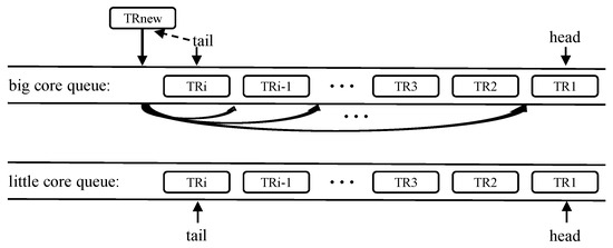 The single-core CPU (Central Processing Unit) performance has stagnated over recent years, and CPU manufacturers have turned to developing multicore processors. For the early multicore processors, the cores are symmetric, and the performance is the same as each other [1,2], which means that each core has the same computation ability and energy consumption characterization. However, as the core number increases from 2 to 8 or more, the overall chip power consumption also increases and induces high costs for the data center and a sharp decrease in the standby time of the battery-powered embedded device (e.g., mobile phone). In order to trade-off the performance and lifetime of embedded devices, ARM (Advanced RISC Machine), AMD (Advanced RISC Machine), and Intel have devoted themselves to developing asymmetric multicore processors (e.g., 13th Gen Intel (R) Core (TM) CPU, ARM A15 CPU), which contain high-performance cores (namely big core) and power-saved cores (namely little core). The ideal scenarios of big.LITTLE multicore architecture is that the big core runs computing-intensive tasks, and the little core runs less computing-intensive tasks.
