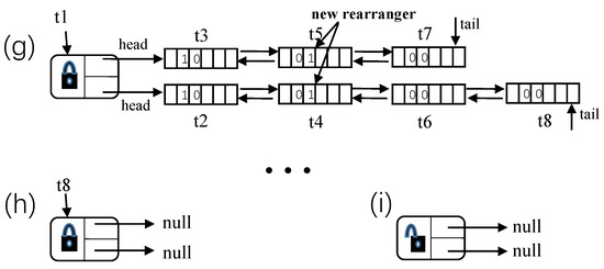 The CAL achieves fairness by locking within and between the big and little cores. Figure 6 demonstrates an example of using the CAL lock algorithm: (a) no thread applies for a lock at the beginning, so the underlying ticket lock is unlocked, and the pointers to the big-core queue and the little-core queue are NULL; (b) the thread makes a request to lock, because at this time the ticket is not locked, and the field is 0, so directly applies for a ticket lock and successfully locks into the critical section; (c) enters the waiting queue through the SWAP atomic instruction because the underlying ticket lock is locked, and sets to 1 to prevent subsequent threads from stealing the ticket lock; (d)–(e) – enter their corresponding waiting queues successively, and as and are the heads of the big-core queue and the little-core queue respectively, they act as the rearrangers to start the reordering operation; (f) completes the task and exits the critical region, and the ticket is not locked, so the head of big-core queue and little-core queue (if it is in the reordering process, it would exit) calculates their and selects a thread to obtain the ticket lock to enter the critical region (here is ), and the rearranger identity is passed to and respectively; (g) t3 becomes the new head of the queue, and remains unchanged. the new rearrangers and respectively begin the rearrangement operation; (h) finally only thread holds the ticket lock, and the pointers to the big-core and little-core queues are set to NULL, and the field is set to 1 to re-open the stealing operation; (i) completes the task and exits the critical section, and the locking process ends.