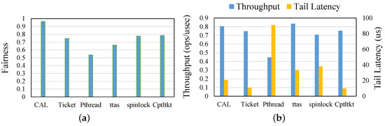 Comparison in a high contention environment. (a) Lock fairness. (b) Throughput and tail latency.