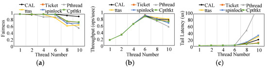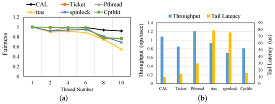 The experimental results are shown in Figure 9. In Figure 9a, we observe that all the lock algorithms maintain high fairness when running on the first six big cores. The FIFO-based ticket lock, due to its inherent strict lock order, demonstrates higher fairness compared to ttas, Pthread lock, and other competition-based locks. With the introduction of little cores, the fairness of locks except CAL has significantly declined, with the lowest drop to 0.56 (ttas), while CAL has always maintained high fairness (above 0.9). In Figure 9b, the throughput of CAL is only lower than Pthread lock’s, but the tail latency is less than half of Pthread lock’s. The ticket lock and cptltkt lock show slightly higher latency than CAL but significantly lower throughput levels. Spinlock has the lowest throughput, which is 53% lower than CAL’s throughput. Furthermore, the tail latency of spinlock and ttas are appreciably higher than that of CAL.