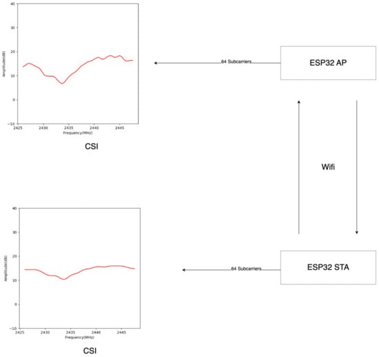 The ESP32 microcontroller [25], known for its affordability and versatility in IoT applications [26] is used in our experiment (Figure 1), which can accurately gather quantitative CSI data. It supports 64 subcarriers but is limited to the 2.4 GHz frequency and a single channel connection with a 22 MHz bandwidth per channel. CSI represents the characteristics of the Wi-Fi signal as it travels from the transmitter to the receiver, interacting with the surrounding environment [6]. This interaction affects the signal, and CSI captures these variations, providing detailed insight into how the signal is modified along its path. CSI is accessible at both the sending and receiving ends, allowing for a comprehensive understanding of the signal’s journey. This is crucial because the receiver can also send data back, creating a two-way flow of information. CSI data is collectible from both access points (AP) and stations (STA), typically yielding similar results illustrated in Figure 2. An AP is a device that allows wireless devices to connect to a wired network using Wi-Fi, while an STA is a device that connects to the network, such as a laptop, smartphone, or IoT device. This study focuses primarily on STA-based CSI data for detailed collection and analysis of the signal variations directly from the connected devices.