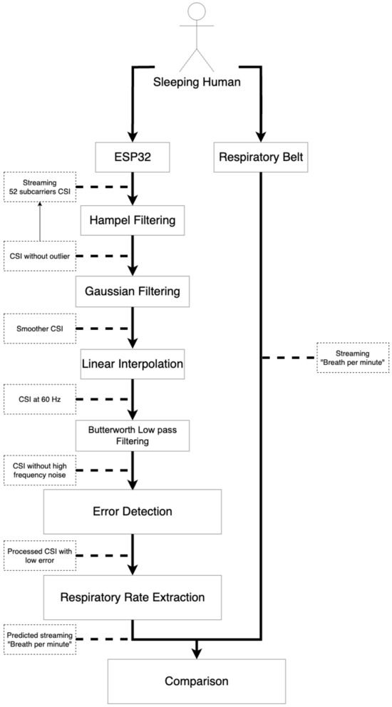 The ESP32 microprocessor is known for its low cost compared to traditional NICs used for CSI data collection [16]. Despite its potential, the ESP32 remains largely untapped in Wi-Fi research for identifying sleep apnea measuring RR. Previous studies [17,18] have utilized the ESP32 with physical instruments for monitoring, but these methods can hinder sleep quality due to their intrusive nature. Recent research employing CSI on five patients has been demonstrated, however, the system was not explicitly tested across varying breathing rates (normal, fast, and slow) [19]. Our experiment aims to measure RR at different rates to identify discrepancies with ground truth across various breathing patterns. Additionally, we introduce a new strategy to correlate Wi-Fi signal fluctuations with RR by addressing noise in raw CSI data, employing a series of signal processing methods—Hampel Filtering [20], Gaussian Filtering [21], Linear Interpolation [22], and Butterworth Low Pass Filtering [23]. These four filters implemented in sequence removes noise and outliers from raw CSI data. However, noise caused by external movements and elements that generate distortions in the rooms other than subject maybe still available in the treated CSI data. Therefore, we detect such anomalies and remove it. Furthermore, extraction of RR is applied using local peak function [24] approach.