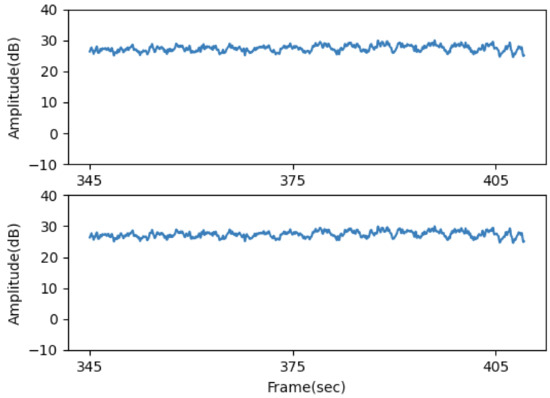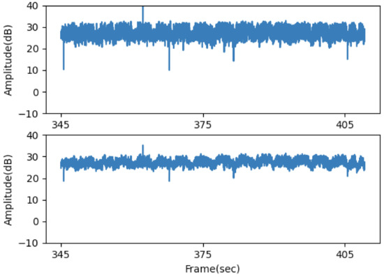 After a series of signal processing methods, we obtain refined CSI data. However, the data still may contain noise caused by external movements. Therefore, we introduce a technique to detect the part containing such noise to enhance the result. We deliberately added a noise during the last part of the experiment. In Figure 10 shows intended noise after frame 385 after applying filtering methods. The extensive difference can be observed after applying Butterworth Filtering. Due to this distinctive nature, we added threshold to determine if that window contain a noise.