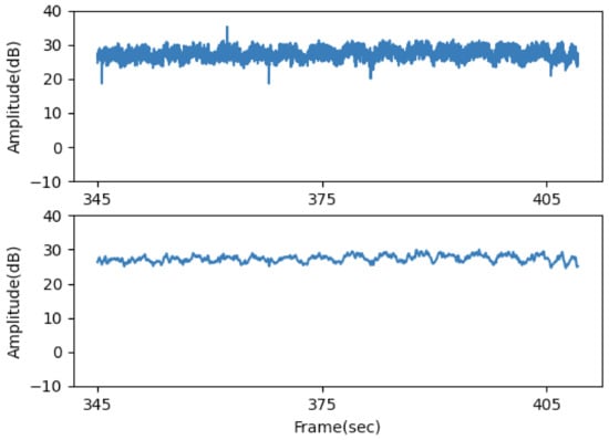 Raw CSI data from the ESP32 are inherently noisy, containing numerous outliers—data points markedly distant from the rest. Ideally, CSI data should form a continuous sequence, making outliers effectively noise. Hampel Filtering is employed to eliminate these pronounced outliers. An illustrative result of this filtering is displayed in Figure 6, contrasting the original noisy input against the refined output with fewer outliers. We adjust the filtering parameters, window size, and , here referred to as and , respectively.
