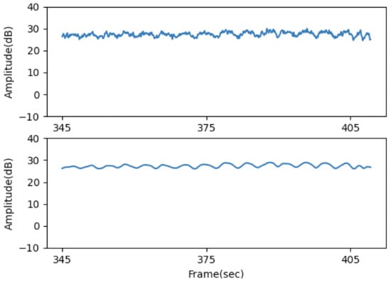 After the initial filtering steps, the processed CSI data begin to reveal respiratory wave patterns. However, these signals are often accompanied by higher frequency noise, which is not expected in a static sleeping environment where the only significant movement is the breathing of a person. To isolate the breathing signal, we apply Butterworth low pass filtering, effectively eliminating any components with frequencies exceeding a predefined threshold. By setting this threshold just above the typical range of human RRs, we can isolate the breathing waveform. Figure 9 demonstrates this filtering, comparing the original input, laden with high-frequency noise, to the refined output that prominently features only the breathing wave. The parameters for this filtering process, specifically the order of the Butterworth filter and the cutoff frequency, are denoted as and , respectively, in our study.