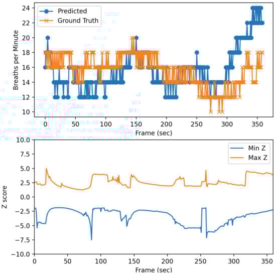 Figure 11 (top) shows poor estimation after frame 355 due to intentional noise. We investigated by plotting Z score as shown in Figure 11 (bottom). Maximum Z shifts explicitly at the frame where prediction went far from minimum Z. Then we set some threshold for the distance between minimum Z score and maximum Z score, denoted as in the study. If any window size has the distance between minimum Z score and maximum Z score higher than , it is considered as noise caused by external movement, and discarded.