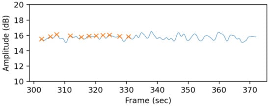 To extract the RR from the filtered CSI graph, we used local peak function [24] to find the number of peak in an interval and scaled it to be a minute resulted as a bpm. There is a single parameter for local peak that is a minimum distance before the next peak. The distance is denoted as in our study. We assume that normal people do not breathe at rate over 30 bpm. Therefore, in 60Hz data with 30 s window, will be . The result in Figure 12 shows that there are 11 peaks in 30 s interval, which corresponds to 22 bpm. This local peak-based method is adapted from [36,37], which is very common approach in heart rate monitoring.