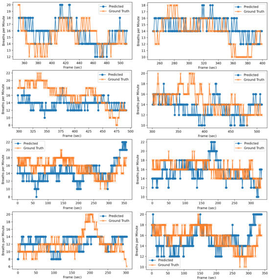 The overall result of bpm for 8 participants with calibrated parameters is shown in Figure 13. This visualization demonstrates that the predicted CSI data, after signal processing and RR extraction, closely matches the ground truth obtained from the Vernier belt. However, significant discrepancy can be observed at certain frames. A detailed statistical analysis is presented in Table 2, Table 3, Table 4 and Table 5.