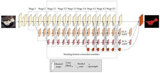 (2) This paper presents a deepened high-resolution semantic segmentation network specifically designed for landslide scenes. By deepening the network’s backbone, a stacked feature module is constructed. This module effectively captures deeper semantic information, enhancing the network’s performance in semantic segmentation of landslide scenes.