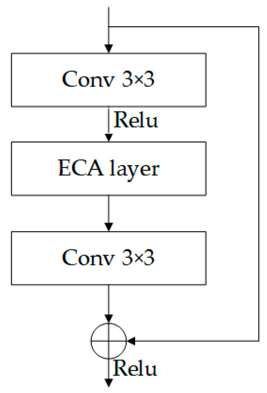The ECA module is introduced into the basic block of the Res-Net, and the network structure is shown in Figure 2. This enables the network to better distinguish between old landslides and backgrounds, and it reduces the degradation of the network segmentation performance due to the similarity of features between old landslides and backgrounds. The paper introduces the ECARes-Net module into the network. The ECA module does not require channel dimensionality reduction operations, with only a small number of parameter additions, thus retaining the informational integrity of the original channel features. Meanwhile, it is also able to better utilize the interdependence between the features produced by the convolution operation, which effectively improves the quality of the feature representation generated by the neural network [31,32]. The mechanism can use global information to selectively emphasize information-rich features and suppress less useful ones. The structure of the ECA module is shown in Figure 3.