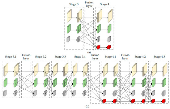 To enhance the network’s capability in extracting image features without overfitting, this paper selected Res-Net as the feature extraction network on top of the HR-Net architecture. This decision aimed to effectively improve the network’s feature extraction abilities while avoiding the issue of excessive parameterization, which can hinder backpropagation during training. The improved network structure is shown in Figure 4. Firstly, the Stage 3 and Stage 4 network modules are stacked. The Stage 3 modules extract feature information from the original image and the image with two downsamplings. The Stage 4 modules extract feature information from the original image and the image with three downsamplings. After several experiments, this paper ultimately used 4 Stage 3 modules and 3 Stage 4 modules stacked. Then, fusion layers are introduced between the newly added network modules. These fusion layers facilitate the combination of features from different scales, resulting in more representative feature maps. This approach effectively improves the network’s segmentation performance.
