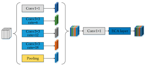 To address this issue, this paper introduces the ASPP module after the second- and third-level features of the DHRECA-Net, which is used to further enhance the network’s ability to detect small-scale landslides. ASPP captures different levels of contextual information by introducing multiple parallel branches in the network, where each branch uses different scales of void convolution and pooling operations. By using different expansion rates for null convolution, the sensory field can be expanded to obtain a broader range of contextual information. The ASPP consists of a 1 × 1 convolutional layer, a pooling pyramid layer, and a pooling layer. In this paper, the layers of the pooling pyramid are used with expansion rate (rate) settings of 6, 12, and 18. In order to enhance the network’s ability to differentiate between landslides and backgrounds, this paper also adds the ECA module to the ASPP structure and constructs an ECA-ASPP model. This module further enhances the network’s ability to extract features from different categories, the structure of which is shown in Figure 5.