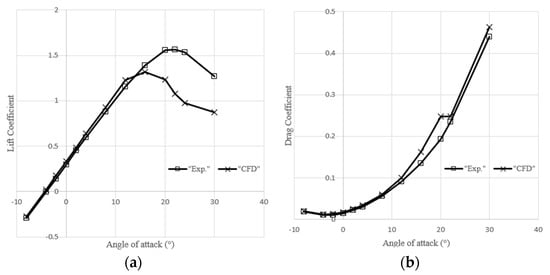 The experiments of the literature research were conducted at different angles of attack, and the analyses of the present study were carried out accordingly. A comparison of the experimental study’s data and the CFD analysis’s resultant data is presented in Figure 4. The experimental results and the mathematical model diverge at angles of attack of 12° and above. At small angles of attack, the results do, however, appear to accord. In the swarm motion analysis, which is the main subject of the present study, small angles of attack were used, corresponding to high performance, so the mathematical model is suitable for the analysis of small angles of attack.