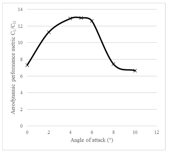 The analysis’s findings indicate that the 4–6° angle of attack range corresponds to a high CL/CD ratio, an aerodynamic performance metric. A value chosen from this range was likewise subjected to close flight investigation. The performance curve is shown in Figure 5.