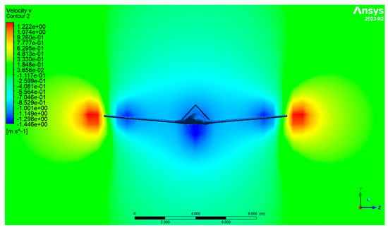 A pressure difference between the upper and lower surfaces of an aircraft’s wing is created when it is flying at an angle of attack and a certain speed. This causes the airflow on the lower surface on the wing to roll over the upper surface, creating an inward curling vortex from the wingtip, which is called wingtip vortex. The entire airplane creates two wake vortex zones that are a specific width downstream, creating an outside upwash flow and a downwash flow between the two wake vortex cores. The schematic diagram is displayed in Figure 6, with the plane that provides it one UAV length behind the UAV. This diagram, which shows the variation in the y component of the velocity in the vertical direction, identifies the upwash and downwash areas behind the UAV.