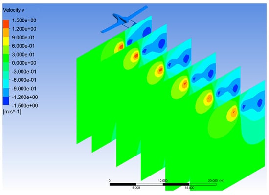 The analysis performed on the UAV shows that there is a small variation in the aerodynamic impact over different longitudinal distances. Additionally, Munk’s theorem [27] and related research in the literature [12,13] are compatible with this approach. Therefore, this study only investigates the aerodynamic effects between UAVs, emphasizing only the lateral and vertical distances. Like the diagram in Figure 6, the distribution of the y components of the velocity is shown in Figure 7 over planes at different distances in the rear region of the UAV. With this visualization, it can be seen that the downwash and upwash areas and the values in these areas do not vary much in the longitudinal distance.