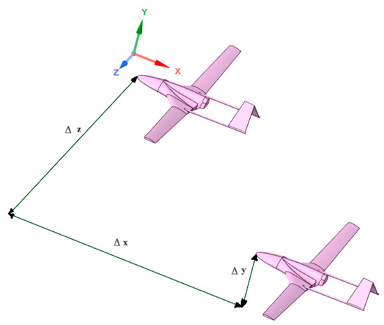The study around the model of the close-formation flight of two UAVs is depicted in Figure 8. The domain where the CFD analyses were performed is box-shaped and its dimensions are height 3.85b (approximately 28 times the UAV height), length 9.5b (approximately 17.5 times the UAV length), and width 5b. There is one UAV positioned in the front, while another UAV trails behind. Both UAVs have matched flying wing configurations and an angle of attack of 5°. The figure illustrates the formation and its coordinate system. In this system, the longitudinal range is represented by the x-axis, the lateral range by the y-axis, and the vertical range inside the formation by the z-axis. Thus, ∆x, ∆y, and ∆z were, respectively, longitudinal, lateral, and vertical distances, as shown in Figure 8.
