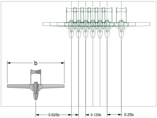 The wingspan of the UAV is represented by b. The numerical calculation arrangement is displayed in Figure 9 and Figure 10, where the trailing UAV is positioned at 1b in the longitudinal direction behind the leading aircraft. The lateral spacing, changed from 0.625b to 1.5b, was taken as the boundary and analyzed, but the distance 1.375b, the distance before the boundary, was not analyzed in order to reduce the number of analyses. The vertical spacing was changed from −0.266b to 0.266b with an interval of 0.133b, which is the ratio of the UAV height to the wingspan (b), as shown in Figure 10. Thirty-five analyses were performed with a close-formation flight sequence consisting of five vertical locations and seven lateral locations, with a single longitudinal location.