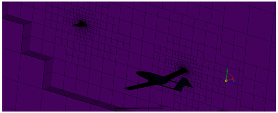 According to the ANSYS quality standards, the average skewness was 0.03 and the average orthogonal quality was 0.96, which should be sufficient. It was decided that the mesh values were acceptable [18]. The mosaic mesh distribution between the two UAVs is shown in Figure 12. For each analysis, the number of mesh elements and the quality values will vary as the UAV models will be in different positions within the domain. However, since the domain size and UAV model geometry do not change, the change in these values will be acceptably small.