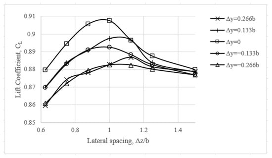 The trailing UAV’s lift coefficients (CL) that are results of the aerodynamic effect are plotted against the lateral distances between the UAVs in Figure 13. In this figure, different vertical distances are shown with different curves. It is evident that ∆y = 0 m always has the maximum CL value for whatever the lateral distance position is. In other words, regardless of the lateral distance, when the leading UAV and the trailing UAV fly at the same altitude, the trailing UAV has the maximum lift coefficient. The ∆y = 0.133b and ∆y = −0.133b curves represent the positions where the trailing UAV flies one vehicle height higher and lower than the leading UAV (0.133b = 1.6 m, where b is the wingspan). These two curves present the same values, except for the points ∆z = 12 m and ∆z = 13.5 m. Similarly, the ∆y = 0.266b and ∆y = −0.266b curves at the positions where the trailing UAV flies two vehicle heights higher and lower than the leading UAV have very close values. However, these curves have lower CL values than the ∆y = 0.133b and ∆y = −0.133b curves. In the same altitude plane (∆y = 0 m) with maximum CL value, it was determined that the CL value decreased by similar amounts when diverging up or down. So, the CL values of the trailing UAV show a symmetrical value change when the same altitude plane is considered as the plane of symmetry, which is consistent with the schematic diagram in Figure 6. In close-formation flight, where the lateral distance between the two UAVs is 1.5 times the wingspan (∆z = 18 m), the CL values are slightly different for different vertical distances. For these positions in the context of CL, it can be said that the aerodynamic effect between the two UAVs is significantly reduced.