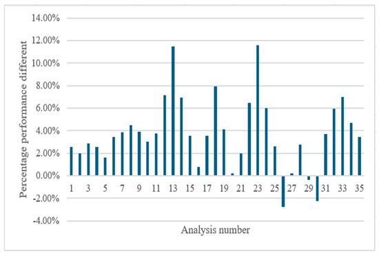 The performance improvement histogram for the 35 analyses is displayed in Figure 16, in which the analysis numbers are as in Table 3. Based on the improvement in the trailing UAV’s aerodynamic performance over the leading UAV’s aerodynamic performance in the same analysis, this histogram was created. The ∆z = 0.875b and ∆z = 1b positions with the best performances are the 13th and 23rd analyses, respectively. In both analyses, ∆y = 0 m and the performance improvements are 11.43% and 11.56%, respectively. The histogram also shows us that there are performance degradations as in the 26th, 29th, and 30th analyses. These are the analyses of the trailing UAV at a lateral distance ∆z = 0.625b. At this distance, the downwash area behind the lead UAV is now more effective than the upwash area.