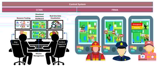 The Control System (Figure 1) encompasses the Command Center Web Application (CCWA) and First Responder Mobile Application (FRMA). On the one hand, the function of CCWA is to facilitate mission planning, management, and supervision. It integrates multiple source data into an aggregated operational picture to be used by a mission commander with the authorization of making mission-relevant decisions. It is responsible for managing drone missions, first responder task assignments, and incident reports for the provision of actionable business insights. It provides real-time information on vehicles, first responders, and critical facilities (e.g., hospitals, bridges, roads).