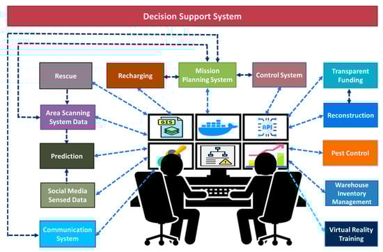 The DSS serves as a central hub, capable of integrating and exchanging data with the aforementioned services (Figure 2). It includes a GIS (geographic information system)-based system for geospatial analysis and can determine danger zones and hazard positions, calculate uncertainty for all its results, optimize sensor positions, conduct scenario planning, and evaluate performance and progress. Moreover, it can validate social media sensed data and predictions, determine optimal resource allocation, and provide insights for reconstruction, communication, and pest control efforts.