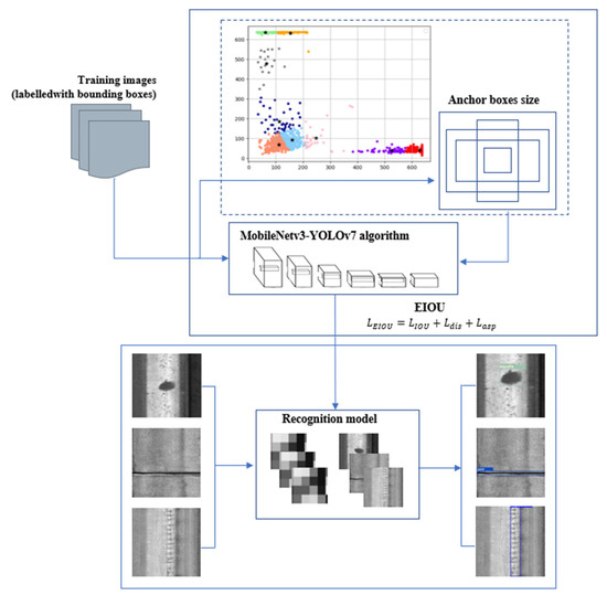 The enhancements to the algorithm are primarily categorized into two aspects: leveraging the capabilities of MobileNetV3 and substituting the YOLOv7 backbone network with the lightweight MobileNetV3 network to establish a symmetrical network structure. MobileNetV3 runs 3 × 3 depthwise separable convolutions on multi-channel convolutional kernels, followed by 1 × 1 pointwise convolutions to reduce the model size. Proper anchor boxes play a crucial role in obtaining an excellent detection model. This paper clusters the rail surface defect dataset using the k-means++ algorithm, and the obtained anchor boxes based on the new clustering results are incorporated into the improved algorithm model, increasing the robustness of the algorithm during training. Utilizing the fast data processing speed of YOLOv7 can accelerate the model’s training speed to achieve real-time data processing. Due to the issue of imbalanced sample quality in the dataset, training low-quality samples can lead to significant fluctuations in loss values, resulting in oscillations in the convergence curve of the loss function. To solve this problem, this paper proposes using the EIOU to replace the original bounding box loss function CIOU, allowing the bounding box loss function to perform the regression more effectively and stably.