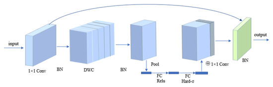 Traditional CNNs have large memory requirements and computational costs, making them unsuitable to run on mobile and embedded devices. To address this issue, the MobileNet [37] network was developed. The MobileNet series is widely used in object detection for its fast and accurate detection capabilities and has become a representative of lightweight networks. The entire architecture of MobileNetV3 largely follows the design of MobileNetV2, incorporating lightweight lepthwise convolution (DWC) and residual blocks. As a lightweight network, MobileNetV3 stands out for using a neural architecture search (NAS) to build the network as well as integrating the depthwise separable convolutions and linear bottleneck inverted residual structures from MobileNetV1 and MobileNetV2. Additionally, it introduces the SE lightweight attention mechanism in network construction. MobileNetV3 has shown excellent performance in tasks such as mobile image classification, object detection, and semantic segmentation. The MobileNetV3 block incorporates features from both MobileNetV1 and MobileNetV2, including the depthwise separable convolution and the inverted residual structure with linear bottlenecks. The former reduces the model’s computational load, while the latter increases the model’s representativeness. Figure 2 displays the layout of the MobileNetV3 block.