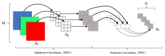 For the commonly used 3 × 3 convolution kernel, DWC can reduce computational costs by approximately 90%, significantly lowering the computational burden. Figure 3 illustrates the implementation process.